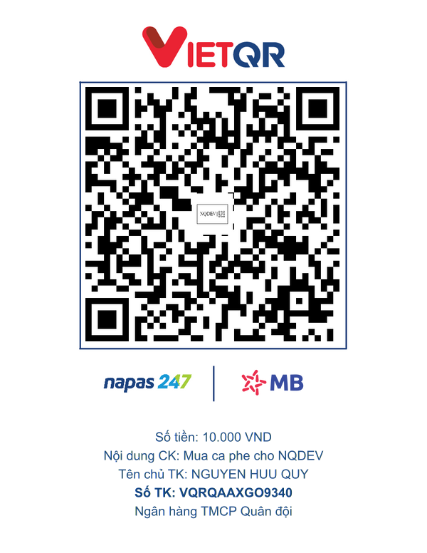 <figure><img src="https://img.vietqr.io/image/MB-VQRQAAXGO9340-gjSyj8L.png?amount=10000&#x26;accountName=NGUYEN%20HUU%20QUY&#x26;addInfo=Mua%20ca%20phe%20cho%20NQDEV" alt=""><figcaption></figcaption></figure>