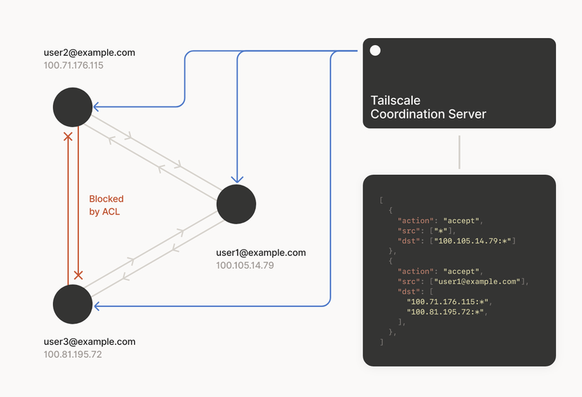 Tailscale tiếp cận theo hướng mỗi node là 1 firewall và hiểu rule policy ACL, sẽ chặn / cho phép theo rule. Vì đã có một máy chủ điều phối, nên các bảo vệ đơn giản là quản lý rule tập trung 1 chỗ trên máy chủ điều phối.