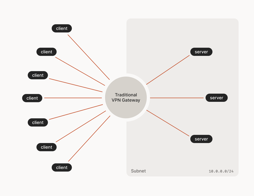 Như các bạn đã biết, mô hình Virtual Private Network (VPN) truyền thống là 1 client kết nối đến 1 server VPN gateway để kết nối các máy chủ, dịch vụ khác bên trong. Với các dịch vụ VPN mua thì chỉ dùng với công dụng để đổi địa chỉ IP và mã hóa đường truyền đến máy chủ VPN đích là chính chứ không nhiều tác dụng secure lắm (Tailscale cũng quy VPN là phần mềm "connectivity" không phải "security")