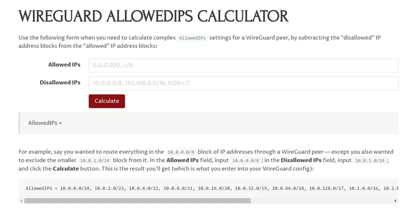 Wireguard mặc định cũng chỉ hỗ trợ cấu hình policy khá cơ bản, nó chỉ có AllowIPs. Ví dụ bạn muốn chỉ đi qua VPN với 1 số IP nhất định, kiểu Split tunnel thì phải tự tính allow ip net ranges, cái pain point này trên mạng có 1 anh blogger làm cái tool để tính như hình trên.