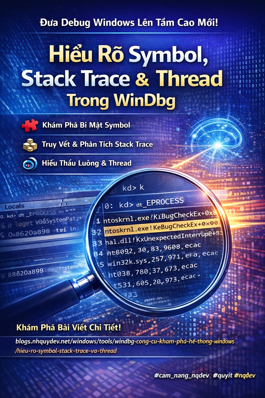 Trong mọi phiên debug bằng WinDbg, có ba khái niệm luôn xuất hiện ngay từ những phút đầu tiên: symbol, stack trace, và thread. Nghe có vẻ quen thuộc, nhưng thực tế, rất nhiều phiên debug production thất bại không phải vì thiếu lệnh, mà vì hiểu sai ba nền tảng này.